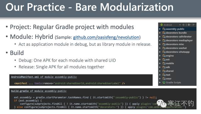 一种轻量的组件化方案,亮点是module在debug模式下作为application,在release模式下作为library,通过共享UID多个module APK运行在同一进程。通过这种方式,各个Module独立运行安装,编译速度也有很大的提升。